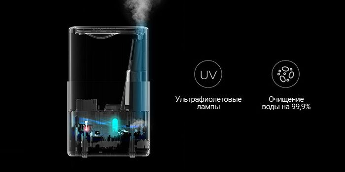 Для очищения воды используются ультрафиолетовые лампы лампы, которые эффективно борются с бактериями, продуктами их жизнедеятельности, а также вредными примесями, очищая воду на 99,9%. Прошедшая очистку вода, наилучшим образом увлажняет воздух вашего дома и заботится о здоровье семьи.