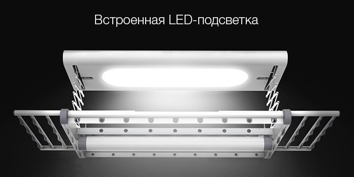 Встроенное лампа освещения размером 70 на 20 см освещает каждый угол сушилки и убирает проблему с недостаточным освещением при большом количестве развешенных вещей.