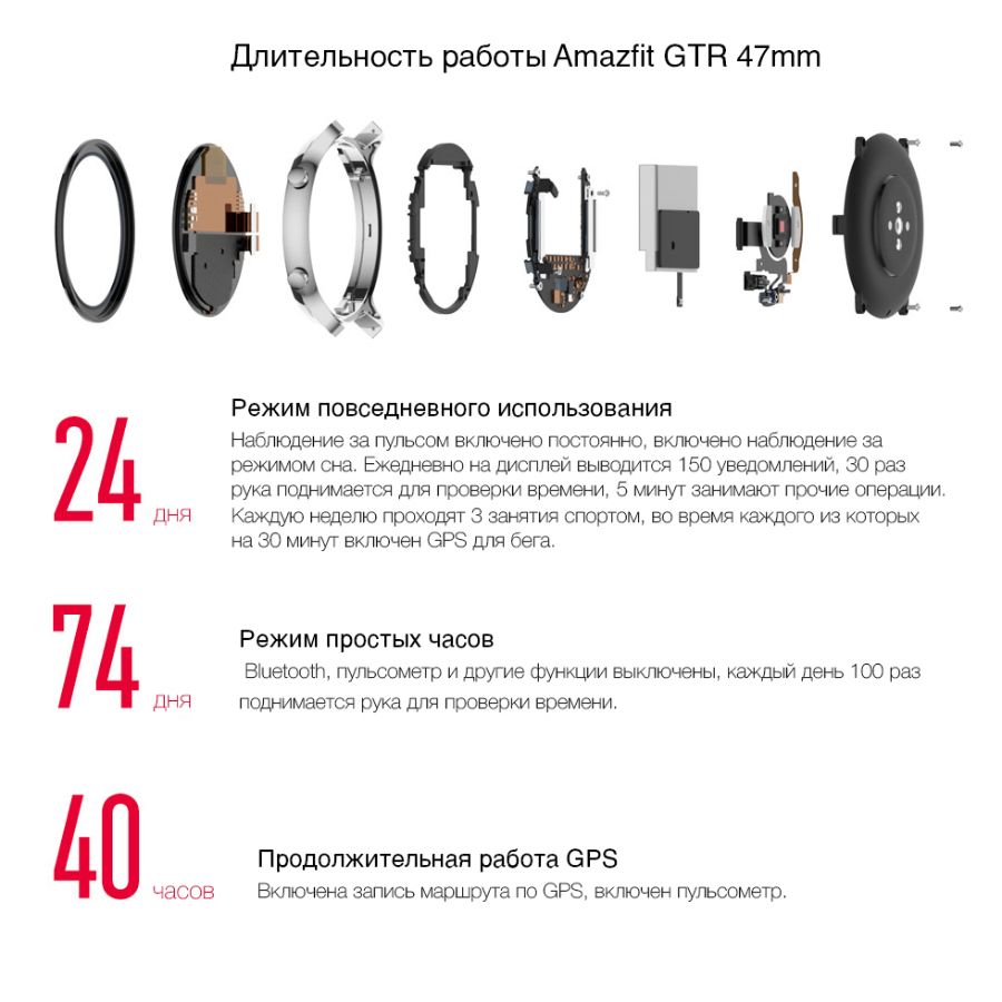 Передовые микросхемы с низким энергопотреблением и инновационные технологии проектирования на самом глубоком уровне оптимизируют процессы и снижают расход заряда, наделяя Amazfit GTR выдающимся временем автономной работы, лишь иногда напоминая о зарядке.