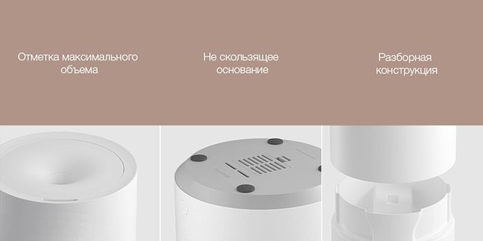 В продуманной конструкции увлажнителя отсутствуют прямые углы. Крышка устройства выполнена съемной, что позволяет быстро получить доступ ко внутреннему резервуару для его очистки.