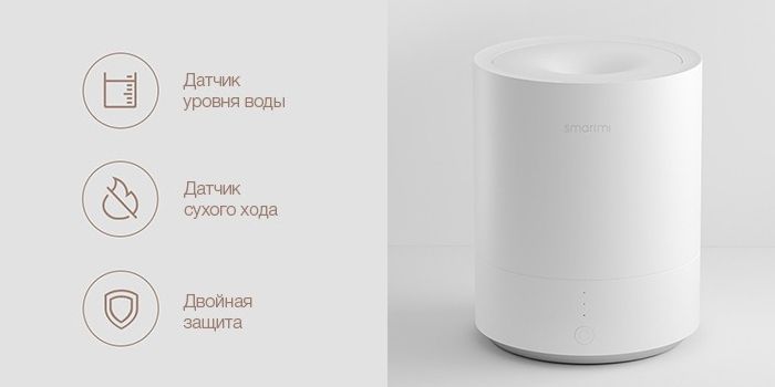 Датчики уровня воды и защиты от сухого хода обеспечивают двойную защиту устройства. Если уровень воды в резервуаре опустится ниже безопасного, увлажнитель автоматически перейдет в режим ожидания, при этом начнет мигать специальный индикатор, напоминающий о необходимости залить воды. В случае включения устройства без воды, датчик автоматически отключит питание, чтобы избежать перегрева и сухого хода.