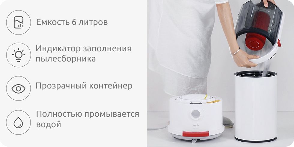 В обычных пылесосах пылесборник и мотор интегрированы с трубкой, что делает процесс очистки пылесборника от мусора затруднительным. Пылесборник, разработанный компанией Deerma, отделен от основного блока с двигателем. Он легко отсоединяется и очищается нажатием на кнопку.