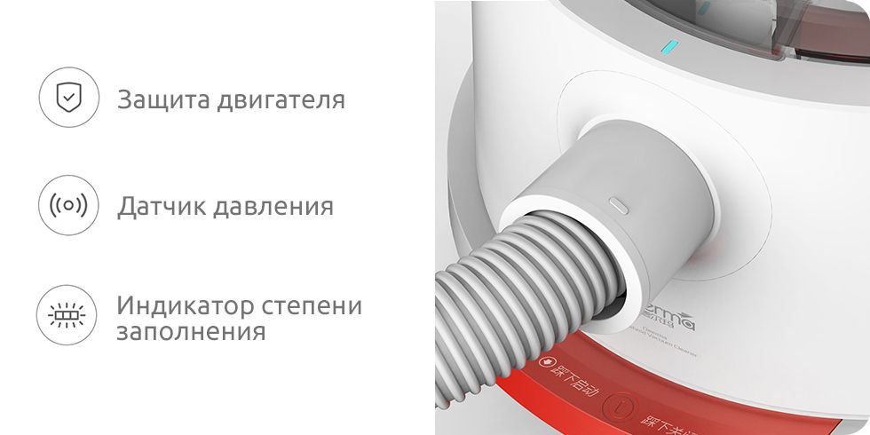 По мере забивания пылесборника мусором или при возникновении засора давление в пылесосе падает. Индикатор заполнения контейнера пылесборника загорится фиолетовым, напоминая о необходимости произвести чистку контейнера. Такая функция помогает предотвратить попадание в двигатель частиц пыли.