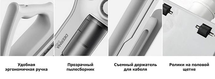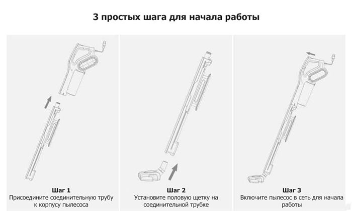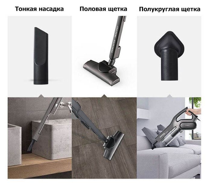 Комплектация: Ручной пылесос, основная насадка, тонкая насадка, насадка с щеткой, насадка для вертикальной уборки.