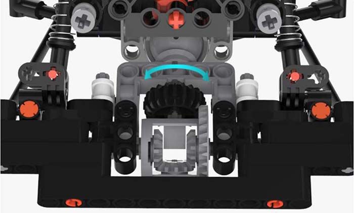 Поскольку пустыни обладают очень сложным рельефом, внедорожнику-багги требуется особая система привода, способная максимально эффективно передать крутящий момент на колеса. Модель внедорожника из Mi Blocks оснащена собственным дифференциалом, созданным по аналогии с настоящими автомобилями, чтобы позволять каждому ведущему колесу вращаться с разной скоростью.