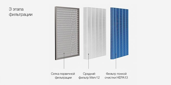 Фильтры: Предварительной очистки, НЕРА-фильтр, фильтр средней мощности Merv 12